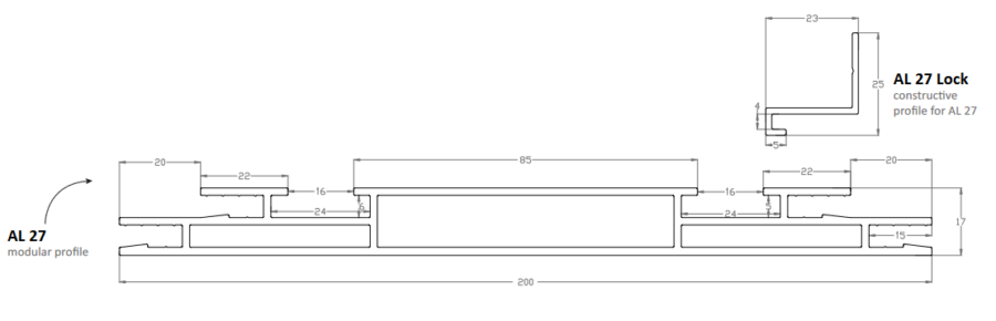 NB! Used with: additional profile AL 27 Lock, profile connectors LC 08, corner connectors LC 10, EXPO or MINI harpoon, ceiling attachments and frame holders for external fastening, Sound Absorption Sheet, U and S-profiles for LEDs. Recommended LEDS – LR 79, LR 80, LR 81, LR 82, screws for LEDs,
