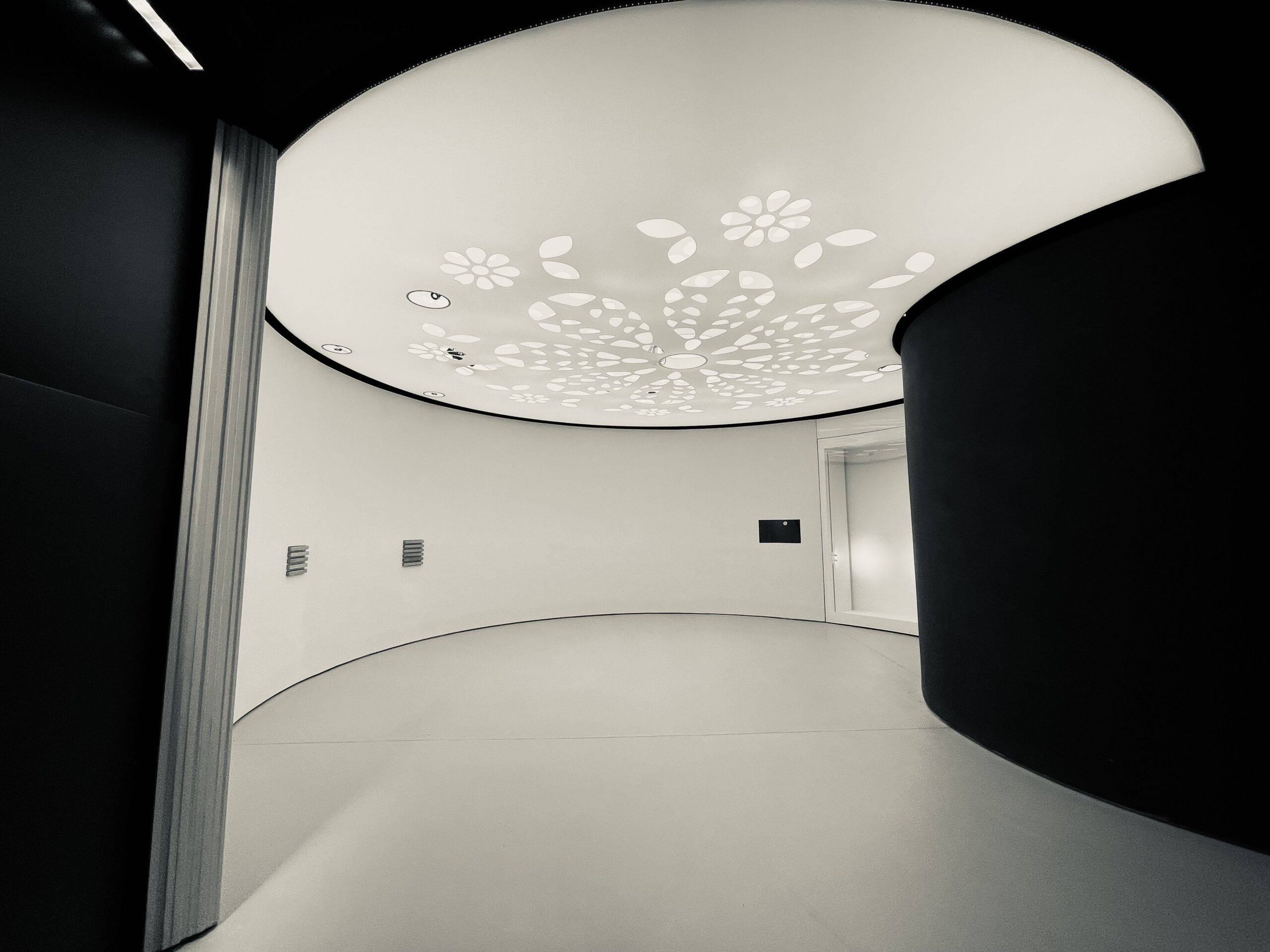 The structure of Vecta Volume is always a combination of two sheets. One sheet is used as a protection layer or a background color, whereas the other one is cut artistically. Both sheets are installed at different distances (starting from very close to each other) creating different visual effects.